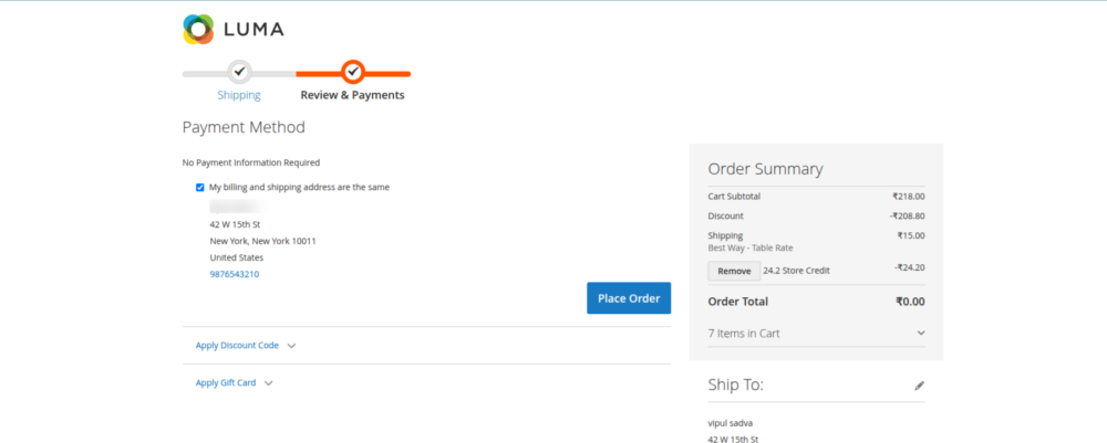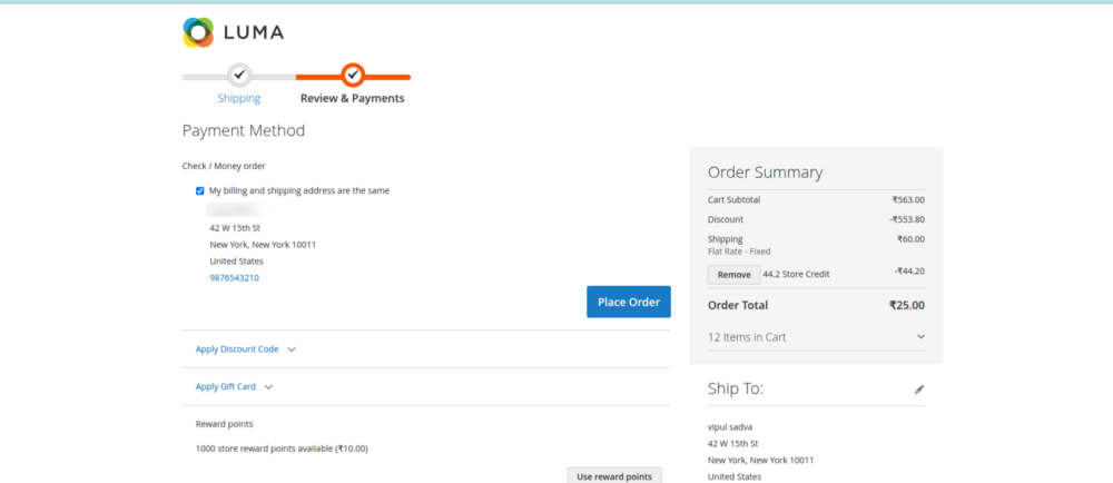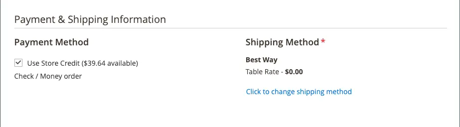 - In the Payment & Shipping Information section, the available store credit balance is displayed.