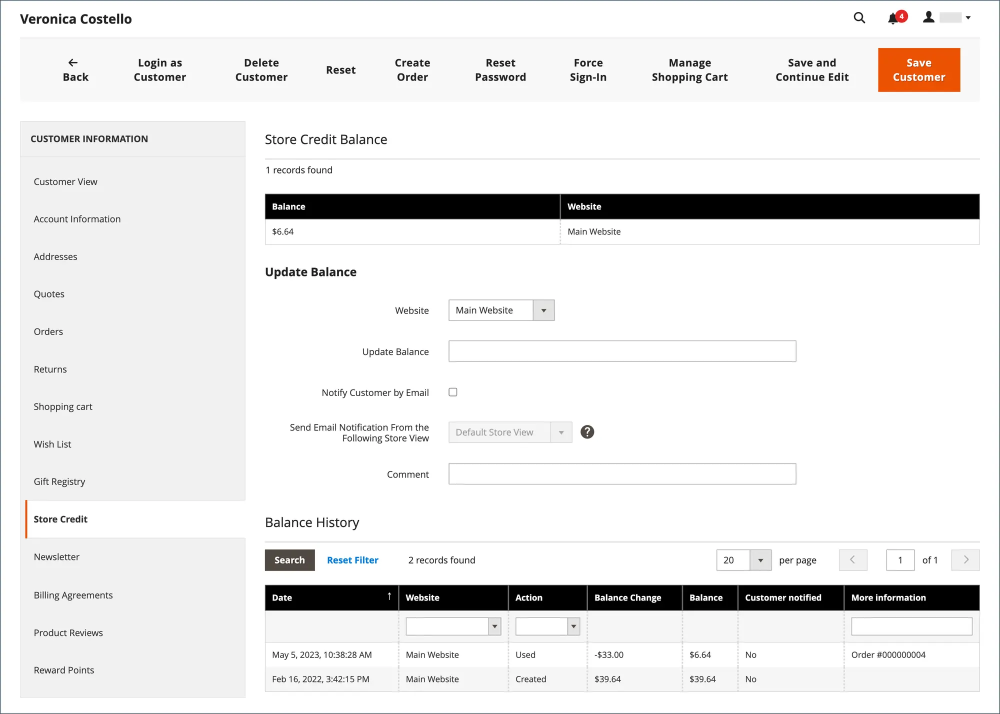 Store administrators can view and manage a customer’s store credit, update balances, and apply credits to orders.