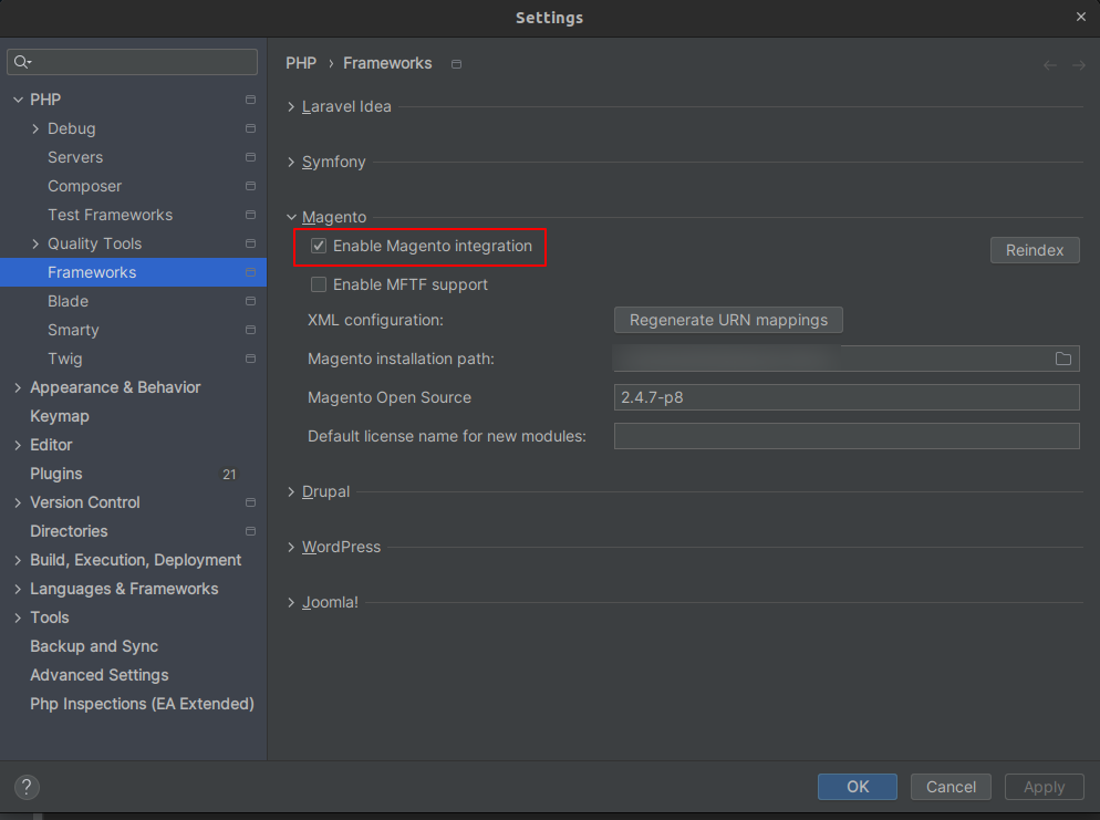 - Open: Settings → PHP → Frameworks → Magento