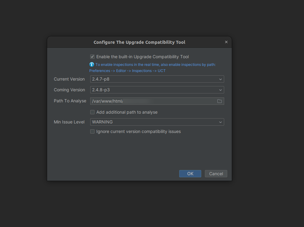 Note: Running the Upgrade Compatibility Tool (UCT) inside PhpStorm needs high system memory, and low RAM may cause the IDE to freeze or hang. To avoid this, use PhpStorm only for file-level or module-level scans. For full project scans, always prefer using the CLI for faster and more stable performance.