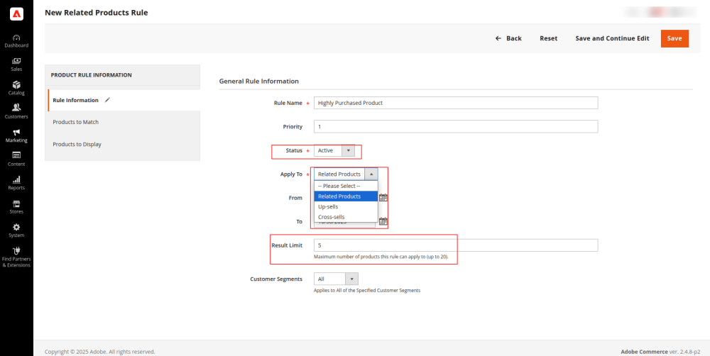 Related Product Rules allow you to control which products are shown as Related Products, Up-sells, or Cross-sells in Adobe Commerce.