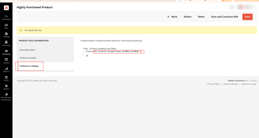 After configuring all sections (Rule Information, Products to Match, and Products to Display), click Save.